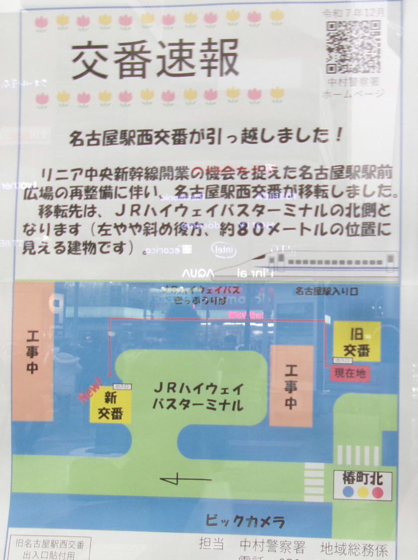 | 2025年12月20日。新交番出来、引っ越す。2階が 網みたいので囲われている。旧交番には右の貼り紙。 |