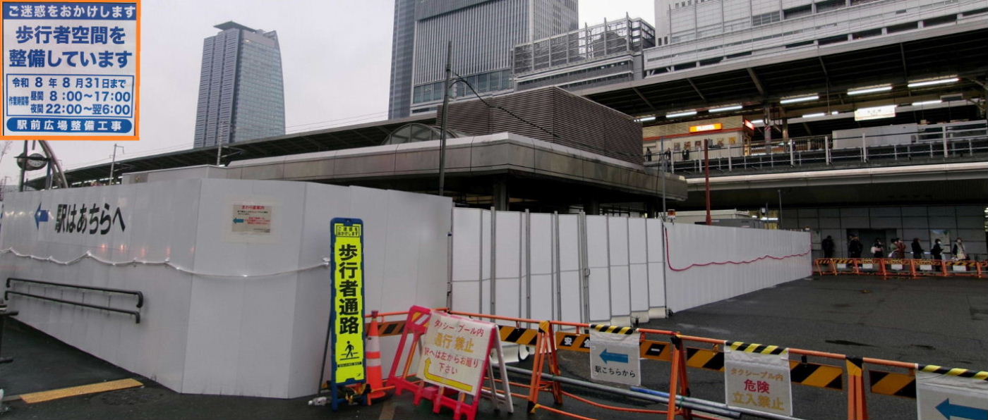 | 2020年02月23日。東から南側にかけてロータリー寄りの一車線が工事柵で囲われて小さい櫓が組まれロータリー撤去等工事に備えたこんな作業中。 |