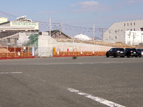 | 2020年04月26日。国道247号線からヤマダ電機の駐車場越 しに見る。仮線は線路の向こう側に敷かれる。 |