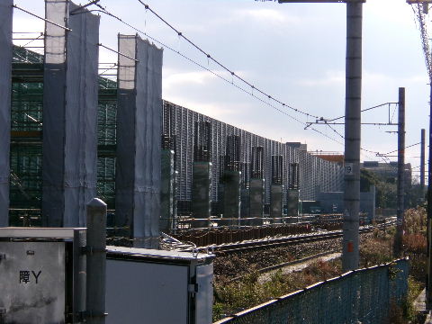 | 2025年03月02日。高架橋作り中。 | 2025年09月14日。足場シートの中、鉄筋組み等 工事が進み見た目が密になってきた。 |