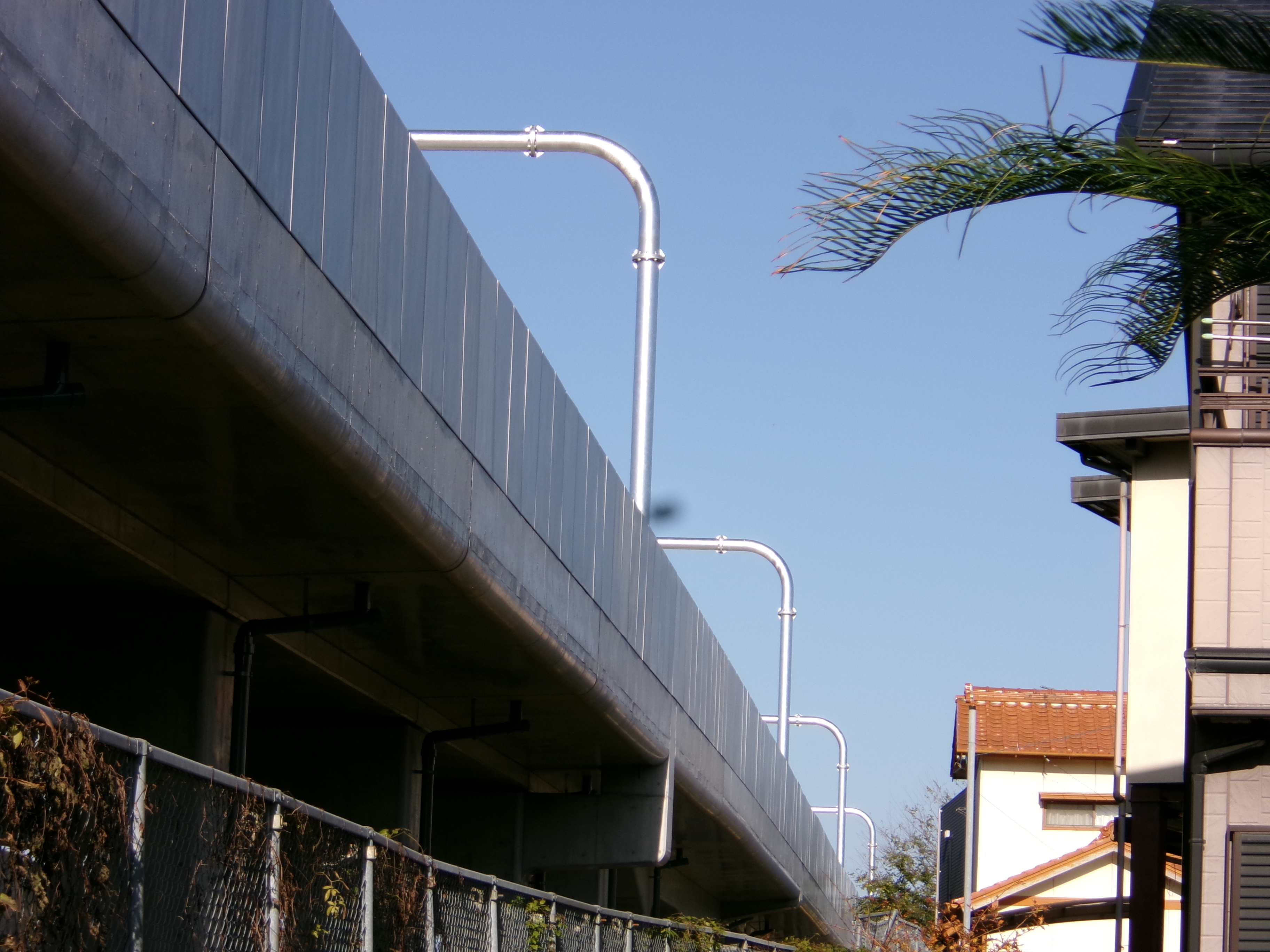 2025年04月20日。竹村方向。ここは高架橋が 地平に下り始めて低くなっているので橋を 架けると同時に保護バーも設置。 |