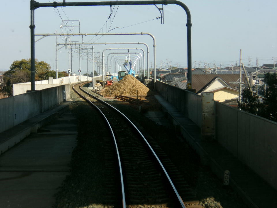 | 2026年01月18日。線路も搬入されている。三河 八橋を出てここまで上り線側を使っているがここ から下り線側に移動するようだ。つまり単線で 開通する。 |