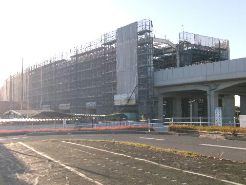 | 2025年11月30日。足場で全体すっぽり囲われる。 | 2026年01月18日。右、下り線の本線側しかない 屋根が出来てきたように見える。 |