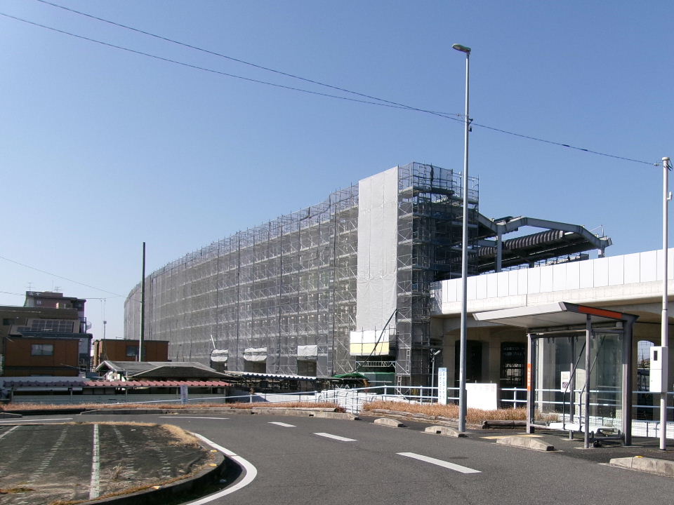 | 2025年08月17日。竹村方の下り副本線高架橋。 | 2025年10月12日。駅前から。ホーム屋根の鉄骨 組みが進む。 |