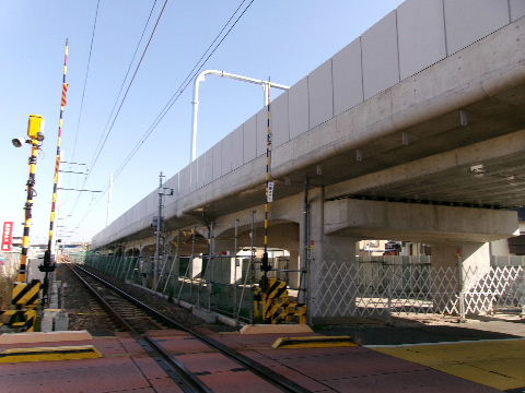 | 2024年11月24日。若林方向。こちらも同様。 | 2025年02月16日。駅方向の高架橋が出来、 踏切上に橋を架ける準備。 |