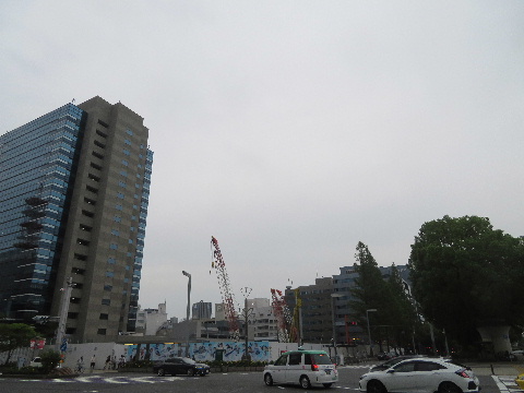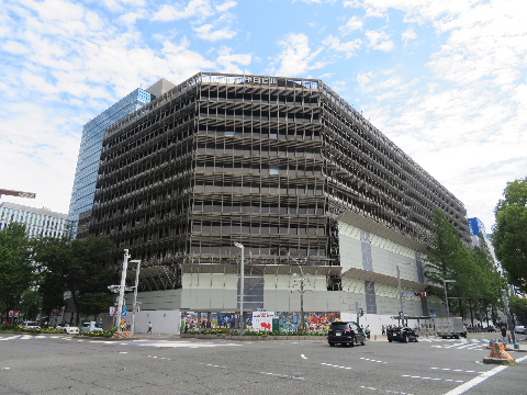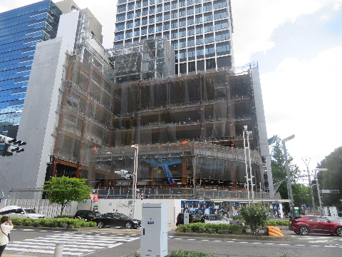 2023年06月24日。南側も工事塀がとれて虎柵になり中が見えるようになった。白いカバーのかかった看板は画像右下の駐車場案内板。トラックの停まっているところが地下駐車場入口で一番奥、最東端が出口になるようだ。 |
