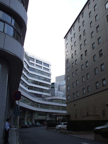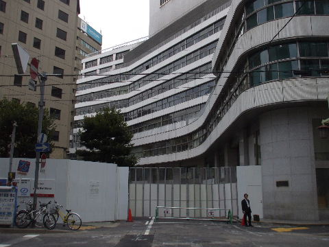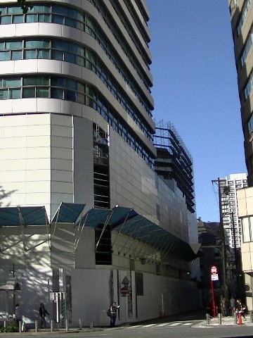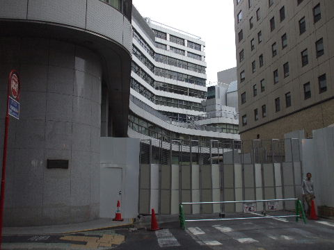 2010年2月13日。この道路は殆んどタク シーと搬入車くらいしか通らず専用道路 に近い。新ビル は道路を挟んだ右のホテ ルの敷地も合わせて建てられる。 |