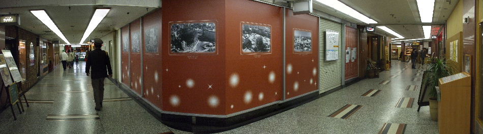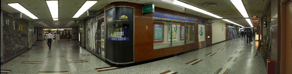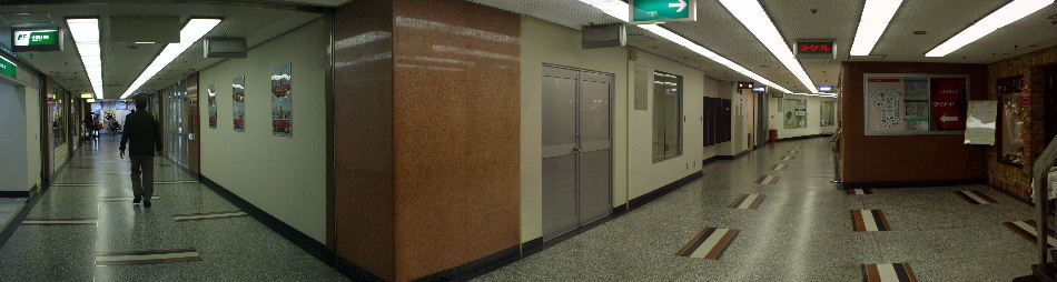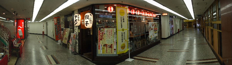 | 2011年2月27日。床面積が広いビルで地下飲食店街も結構広い。飲食店とそれ以外の物販店等で半々くら い。オフィスビルなので土日は閉まっている店もある。右が駅前の通りに沿った通路。左が中央のエレベーターホール。 |