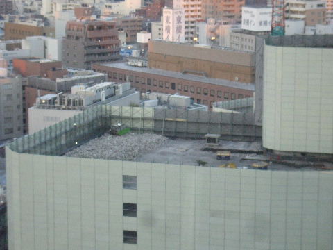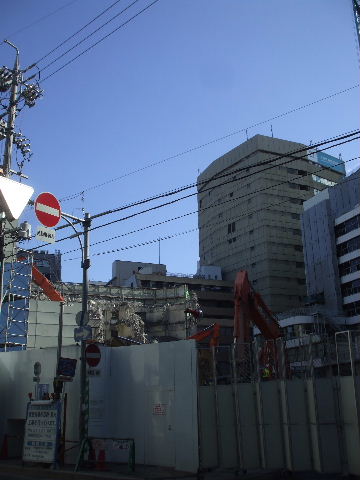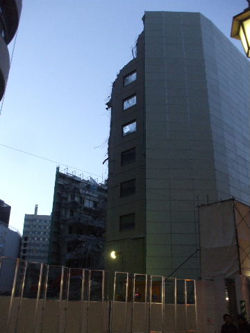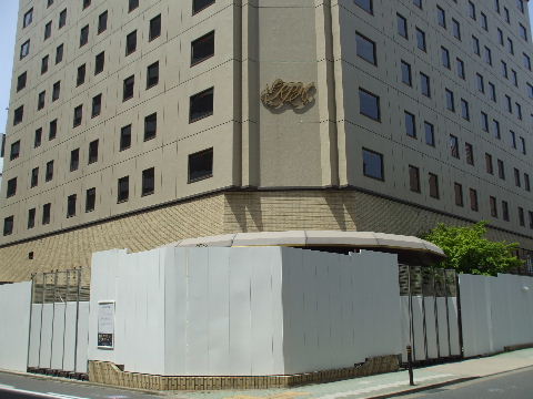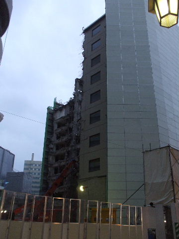 | 2012年12月8日。ホテルにはでかい穴。 | 2012年12月16日。看板外されビル名がわからなくなった。 |