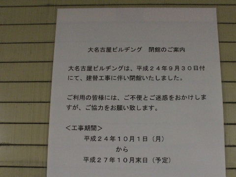 2011年5月5日。2011年2月で閉鎖。塀で囲まれたがビル解体は 大名古屋ビルと一緒のようでそのまま になっている。 |