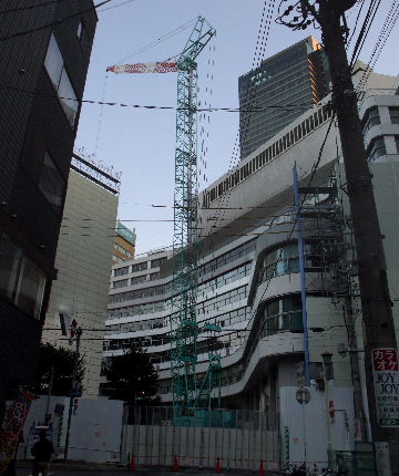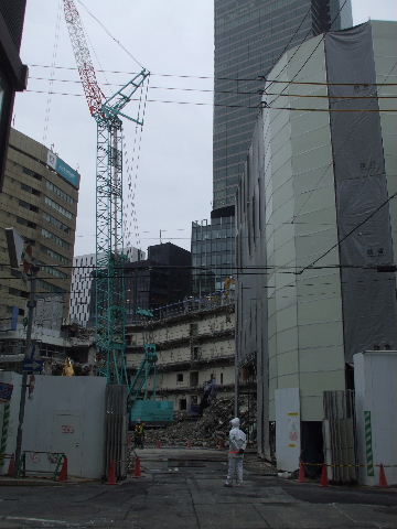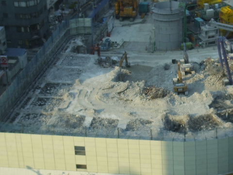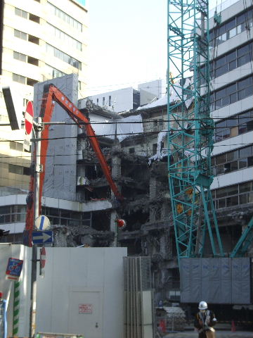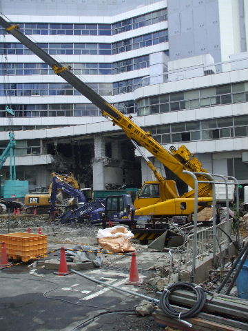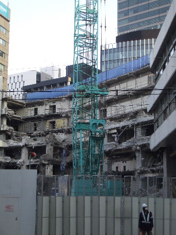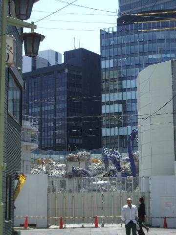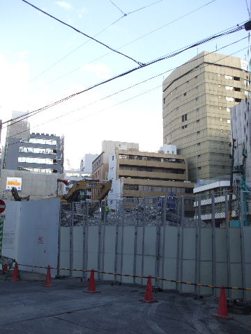 | 2005年8月13日。裏のホテルの用地を合わせると少し辺が膨らん だ三角形になる用地に新しいビルが 建つ。 |