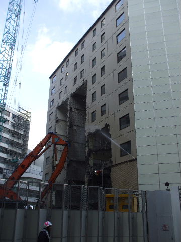 2013年4月28日。裏側は既に1階も崩され ていて上の重機は自力で地面まで降りられ る。 |
