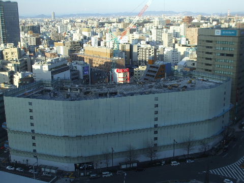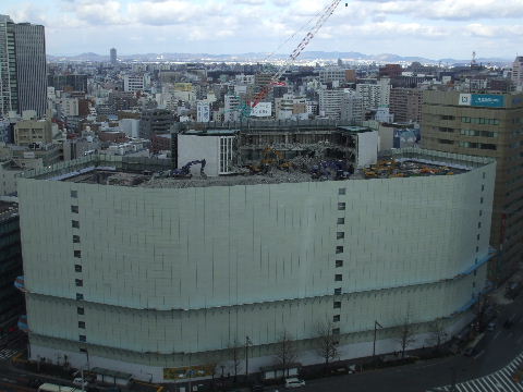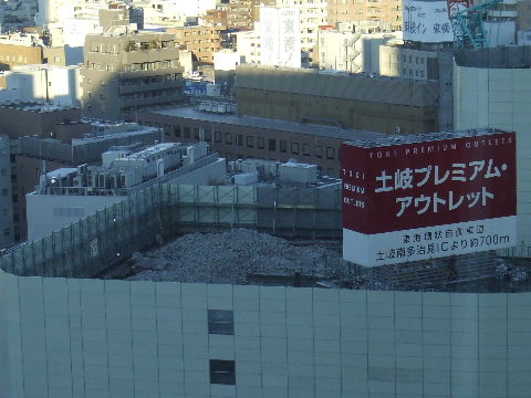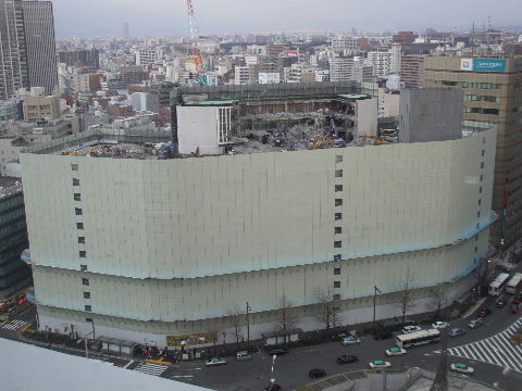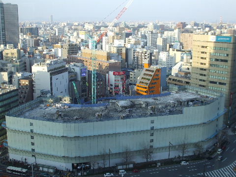 | 2013年1月5日。広告塔も見えなくなった。 | 2013年1月12日。左側広告塔撤去され、「大名古屋…」の名称看板があった所も解体が始まって少し低 くなってきた。 |
