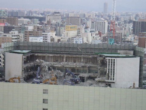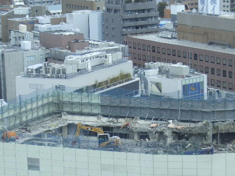 | 2012年12月16日。上まで抉られる。 | 2012年12月24日。屋上の諸々を取り外したコンクリートの破片が 山になっている。 |