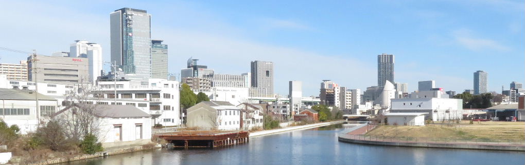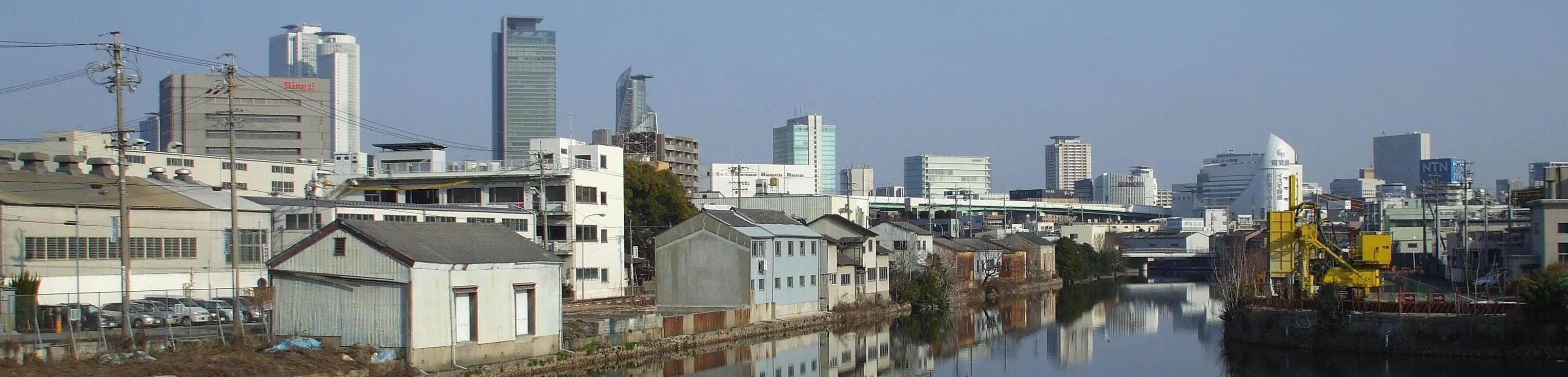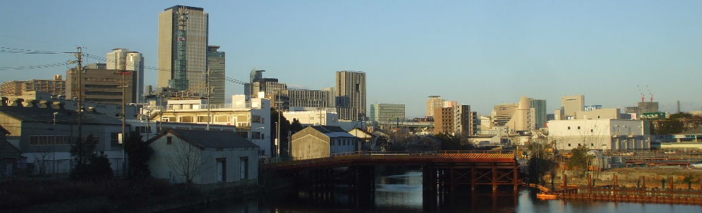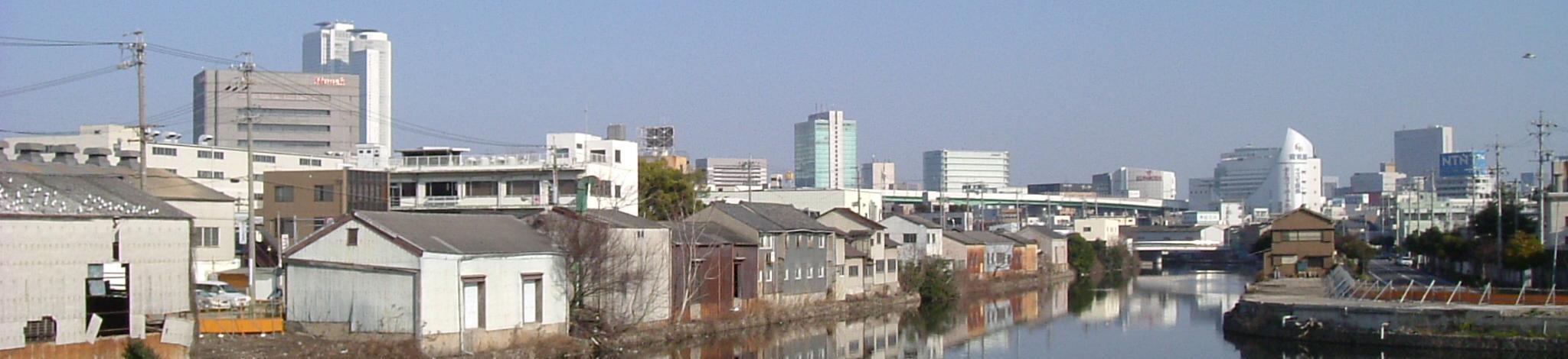 名古屋市中川区の中川運河小栗橋から見た名古屋駅方向の写真。2004年1月1日、高いビルはセントラルタワーズと住友生命ビルくらい。