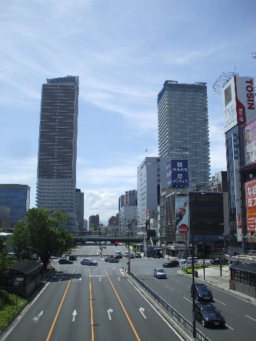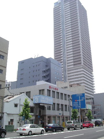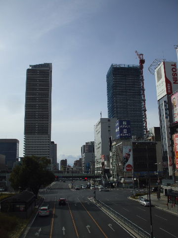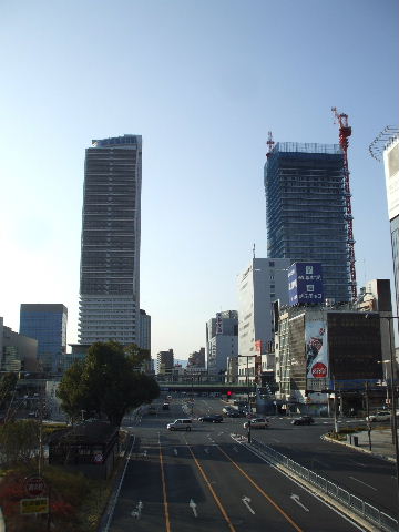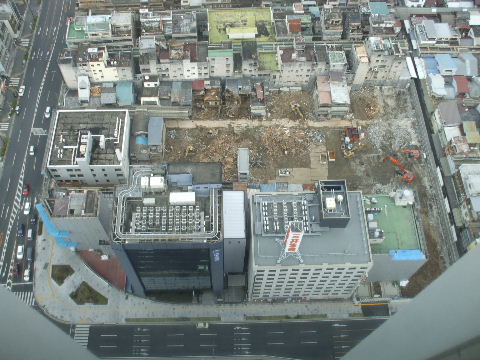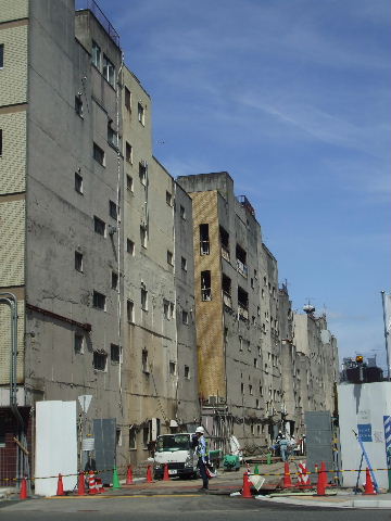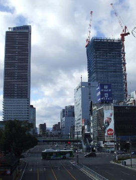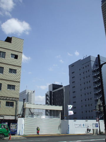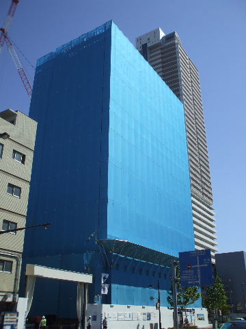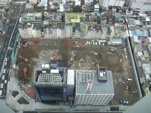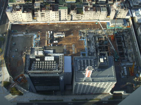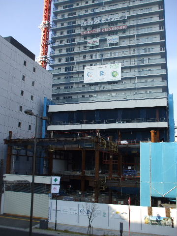 | 超高層棟15階、低層棟10階。 | 超高層棟17階、低層棟は屋上周りに鉄骨を組んでいる。手前 交差点側は広告塔か。 |