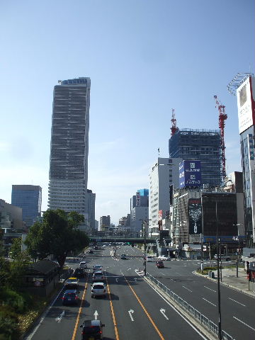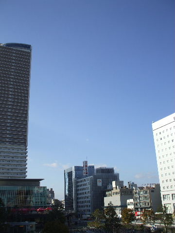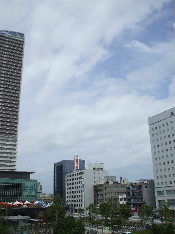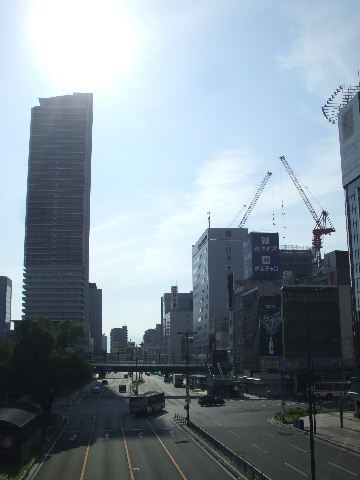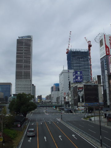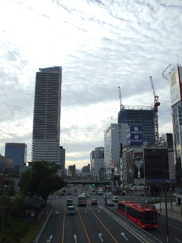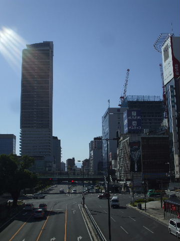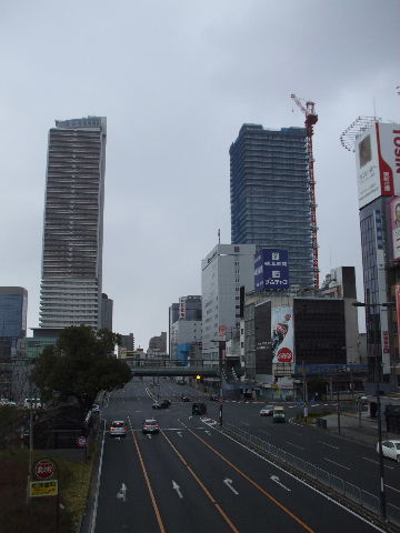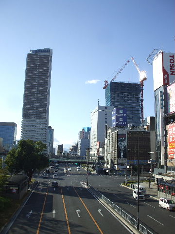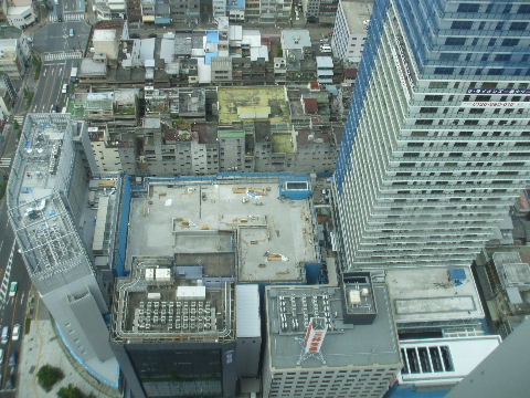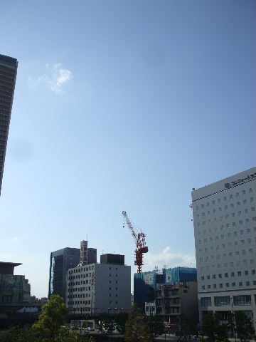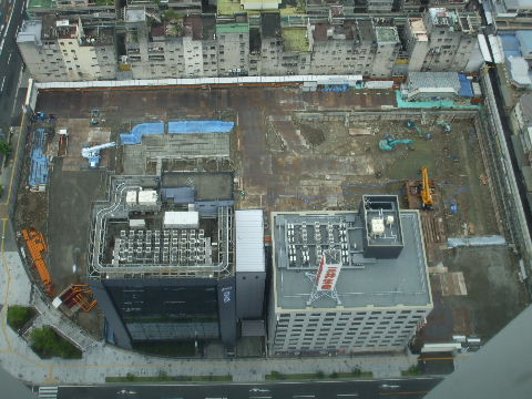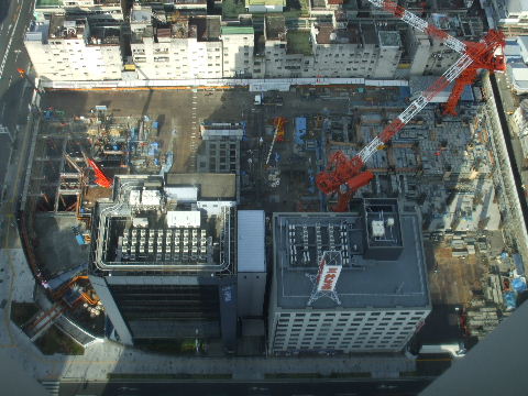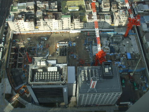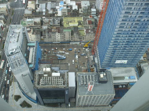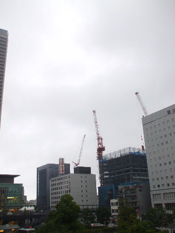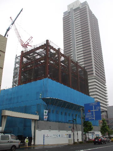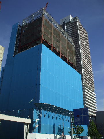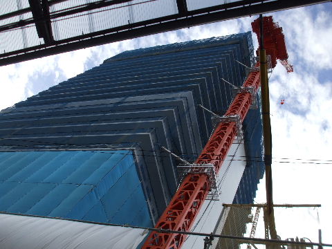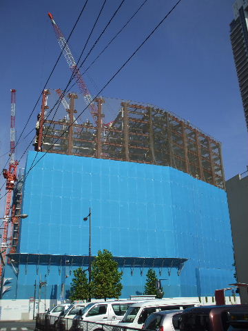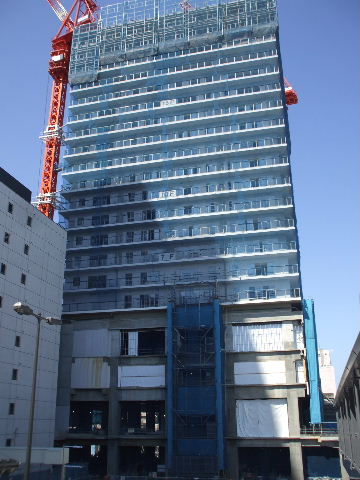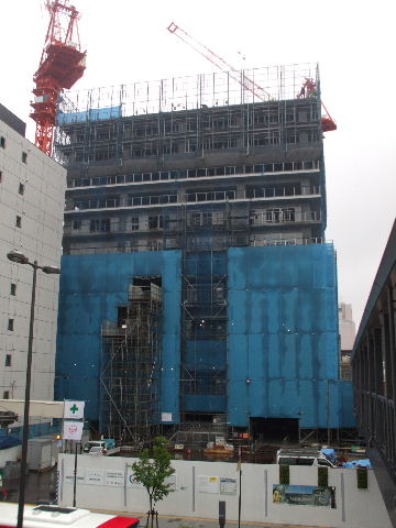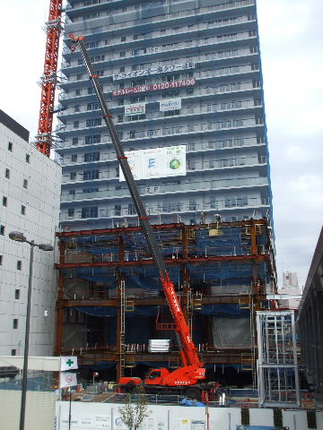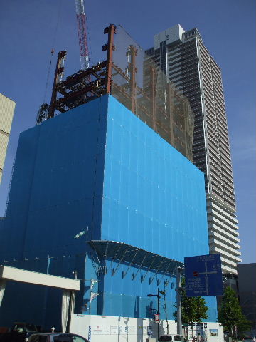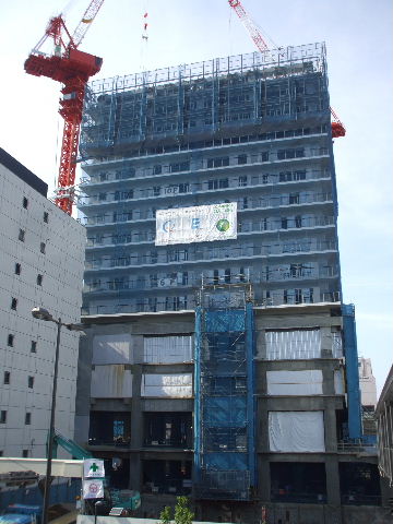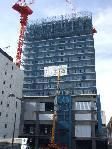| 商業施設の入る2階まで、オフィスの入 る4階までとその上の住宅部分で外観が 大分と違う。住 宅部分にとりかかってペ ースが上がったようだ。 | 東から見る。手前のビルの頭越しに見え るようになってきた。 | 大体週一の