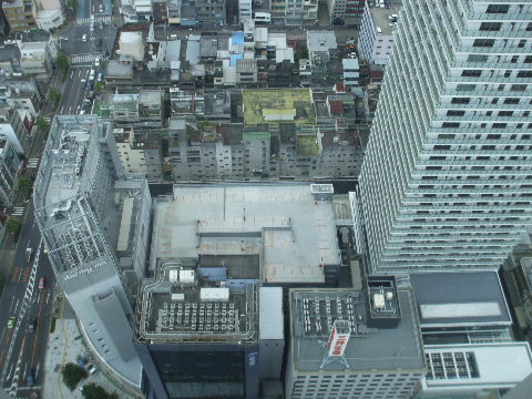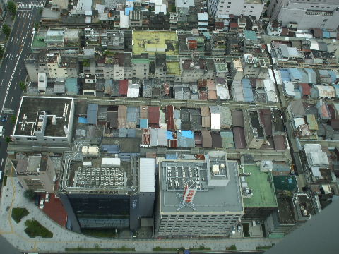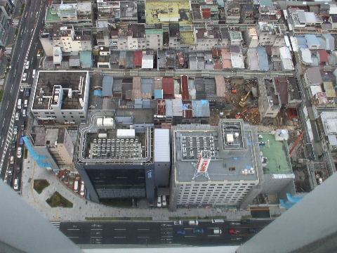 | 岐阜シティ・タワー43展望室から見下ろす。手前から二筋目 までが用地。駅前通沿いの二棟のビルを 囲い込む ような 「コ」の字型の用地。 |