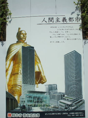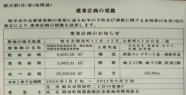 | 予定地。岐阜駅前の通りを挟んだ岐阜シ ティ・タワー43の真向かい。 | 予定地 内に掲出 された計画看板。 |