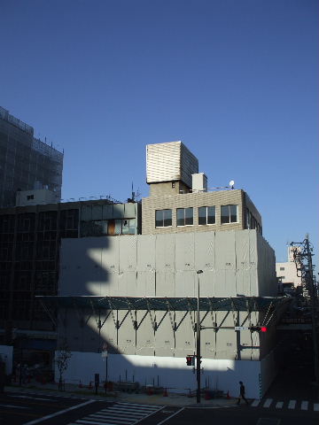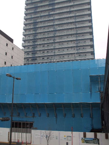 | 商業施設部分にシートがかかり内外装 工事中のよう。 | 北面。 | 問屋の古い建物の向こうにクレーンもと れた新しいビル。 |