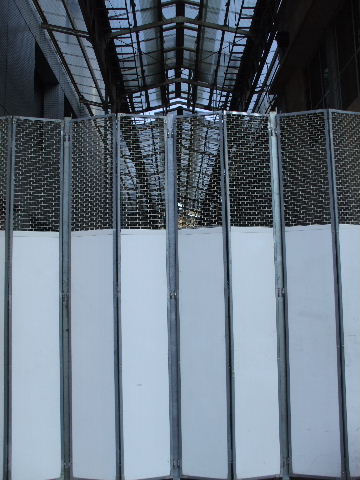 | 高い塀が撤去されて問屋街に面した東、北側も見えるようになった。 | 見た目あまりに落差の大きい北側の問屋 街の壁。どこかの廃墟を撮影する映画の セットに使えそう。 |
