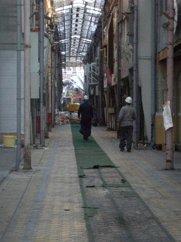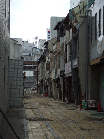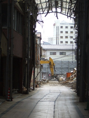| アーケード沿いの建物の撤去がかなり進んでいる。 | アップしてみるとちぎれたようなアーケードと解体中の建物。 |