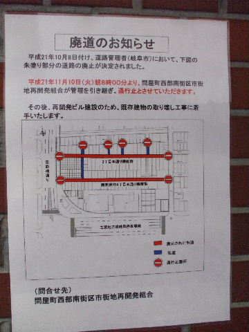 アー ケードが落ちているのが見える。 | この2本の道は廃道になるという掲示。 |