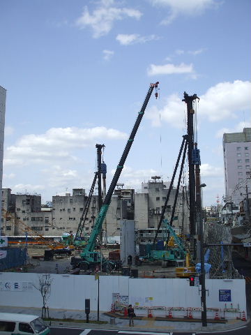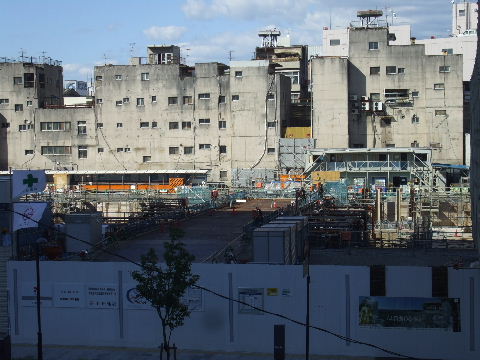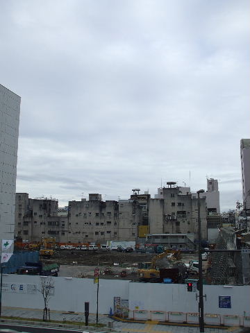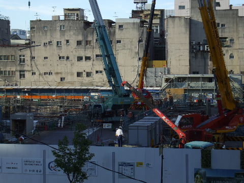 ろは工事現場。 | 駅前からはビルの間に重機が並んでい るのが見える。 |