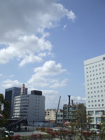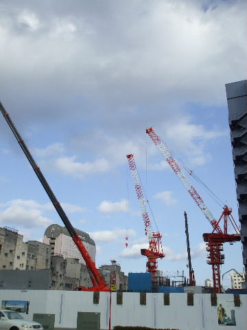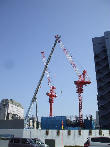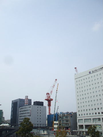 | クレーンの腕が交錯。 | JR駅前から見る。 |