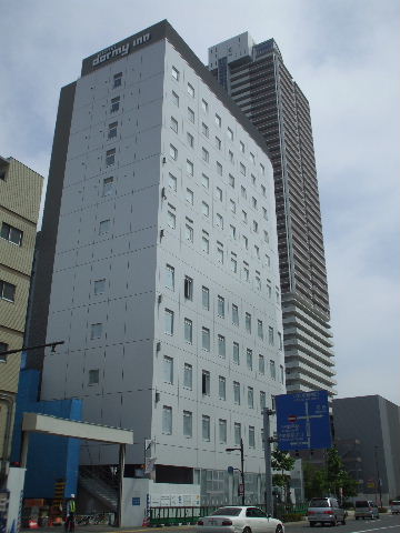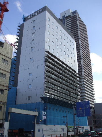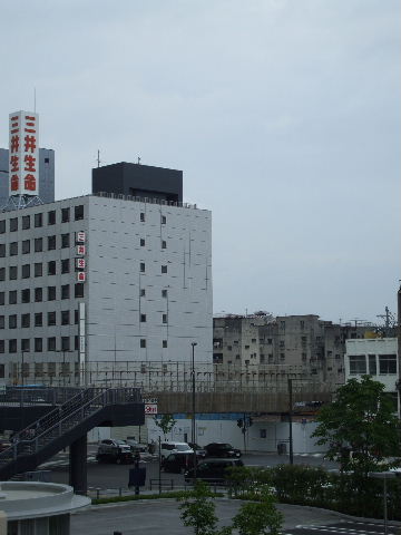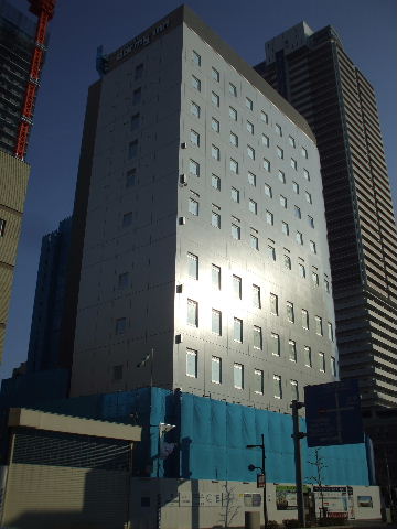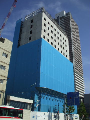 | 商業施設部分入り口上に名前入る。 | ホテル棟、塀がとれて全体が見えるよう になった。 | 南西側から見る。 |