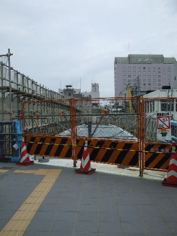 たところ が現場入口になっている。 | まだビルも無いうちから駅前の道路を跨 いでシティ43前と 結ぶ歩道橋を架ける工 事が行われている。 |