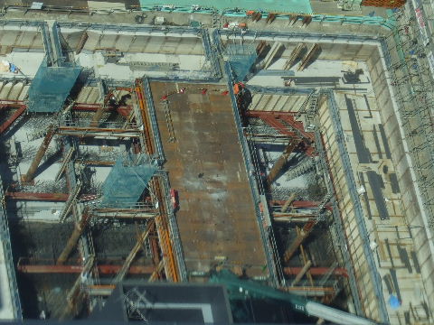 | 敷地全体、重機の通り道になる所に鉄板が並べられている。 | 基礎工事が始まっている。超高層棟の建つ東(右)寄りが少し 掘り下げられている。 |