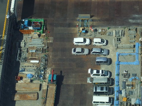 | 西寄りは低層の建物なので工事はまだ先のことと思われ、 資材や車をおくのに使われている。 |