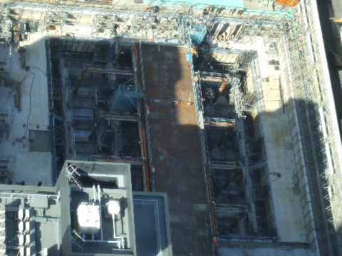| アップして見る。作業用エレベーターのある所を残して鉄骨組 みや床張りが行われている。 |