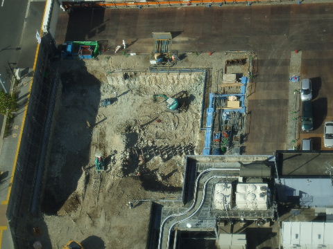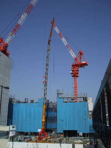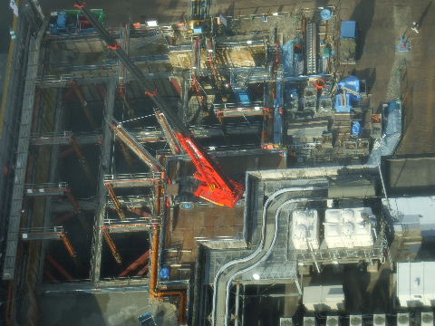 | 超高層側にはクレーン車が4台、低層側はビルが建つ範囲 の掘り下げが 終わった所か。 |