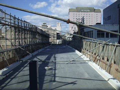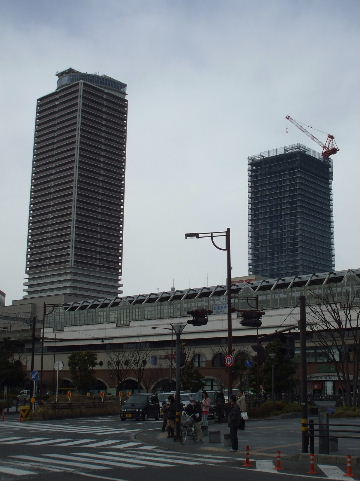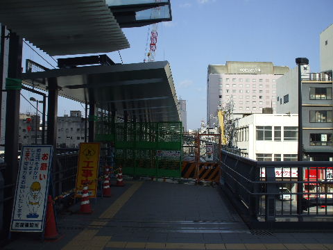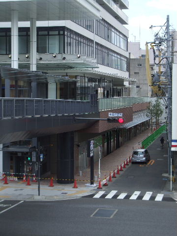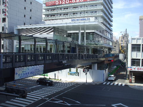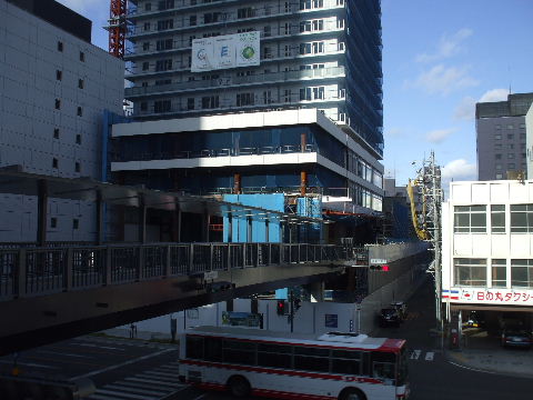 | 駅前の通りを渡るデッキに屋根を取り付け中。 | 西から見る。手前が低層部。 |