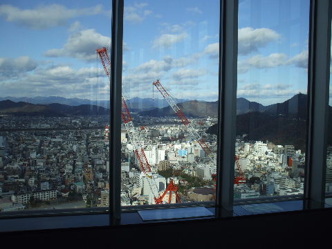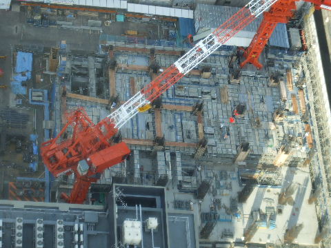 | 展望台景色にクレーンが覗く。 | 35階まで来てクレーンの肩の関節の少し下まで見えるように なった。 |