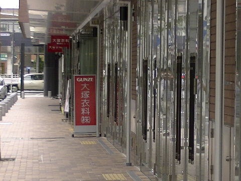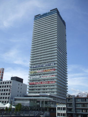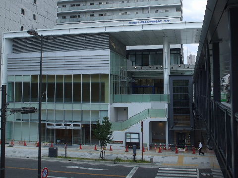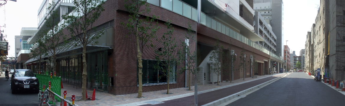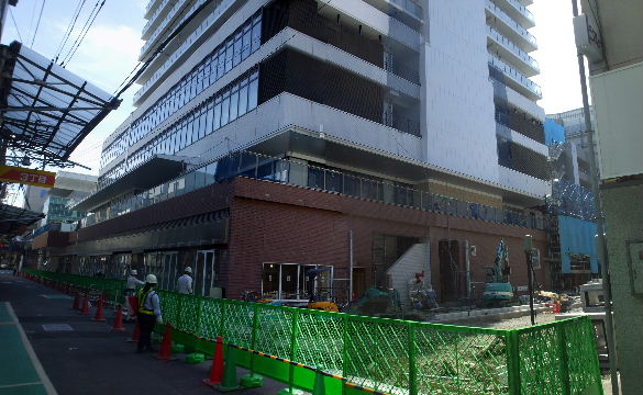 | 横断幕も外されてすっきり。 | 低層階商業施設部分を正面から見る。 |