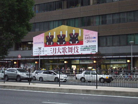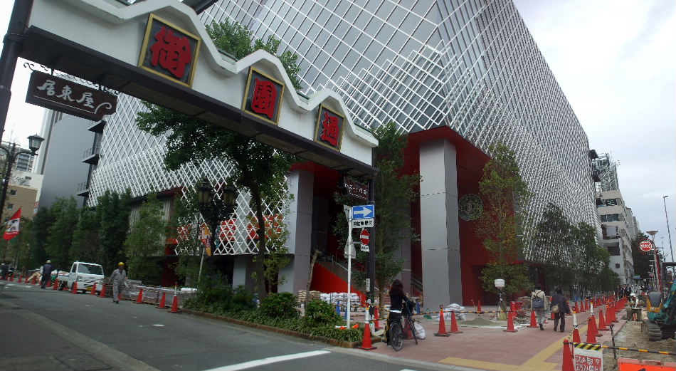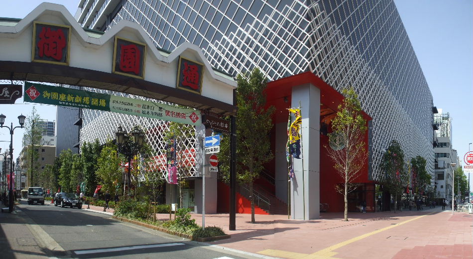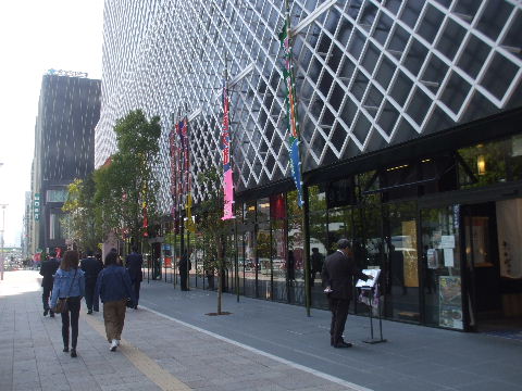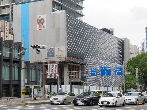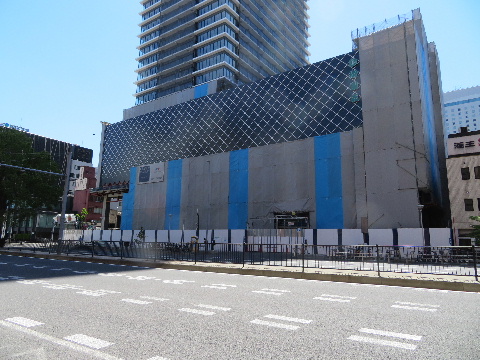 2017年05月28日。低層の劇場部分の正面 壁が見えるようになって北寄りに名前。 |