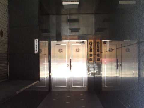 | 2017年09月02日。劇場部分の裏側は黒一色の地味な外観。 | 2017年09月15日。正面入口は朱色。 |