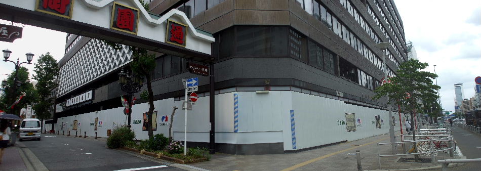 | 2014年6月21日。1階が塀に囲まれて6月半ばから解体工事が始まっている。先ずは中の外せるものを外す工事なので暫らくは外観はこの まま。 |