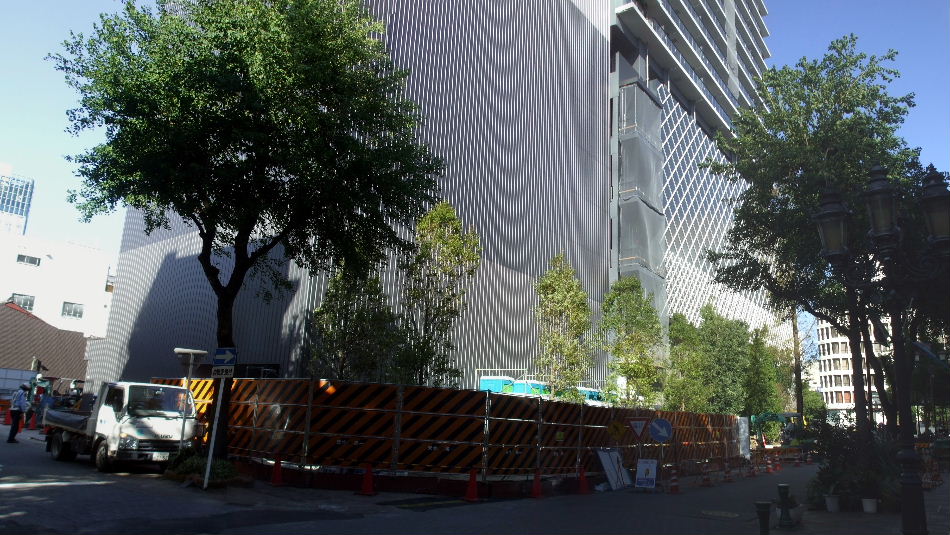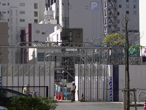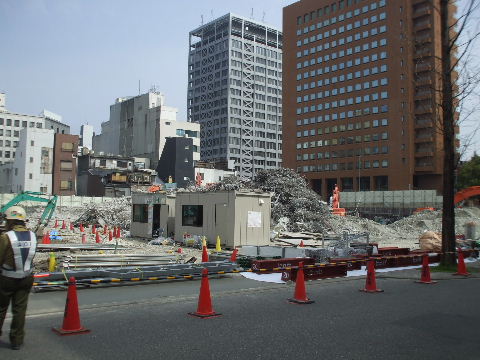| 2015年03月14日。塀も外され始まり、瓦礫もあと一山。 | 2015年04月25日。起工式も終わり、塀も新しくなったが中では地 下に埋まっている前のビルのコンクリートをほじくり出す工事をし ているようだ。 |