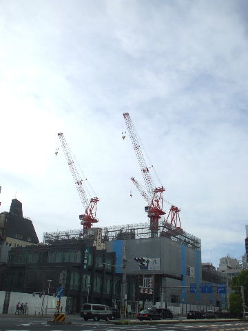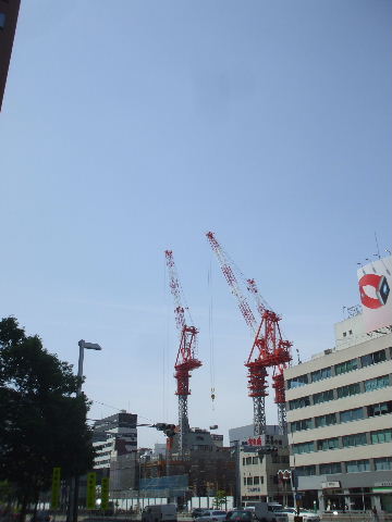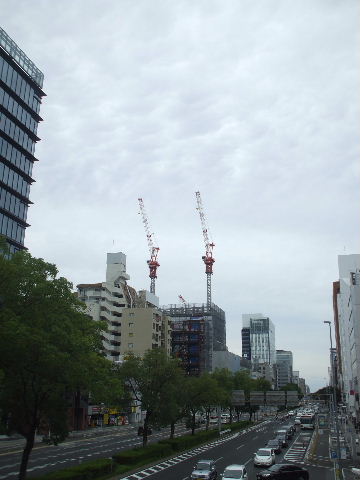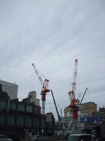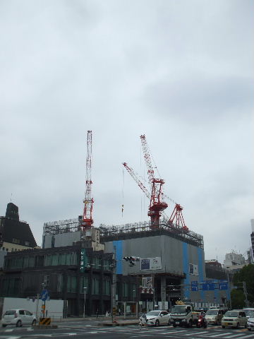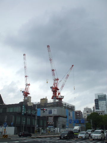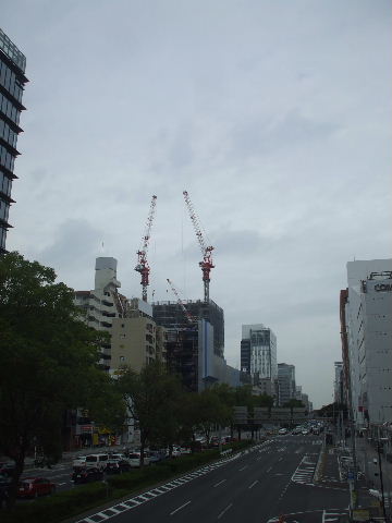 | 2016年10月09日。クレーン高くなる。手前に も別のビルの鉄骨を組んでいて蔭になりそ うだがこちらはここまでの高さのようなので この先は上へ伸びるのが見える。 |