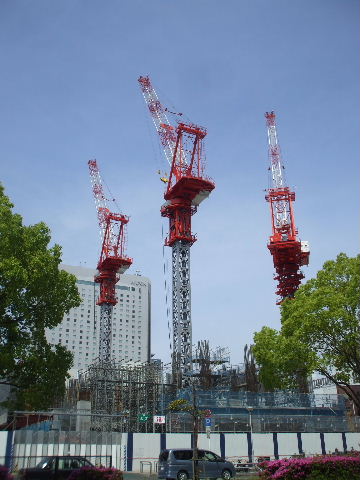 | 2016年08月06日。超高層部を組む手前(南) のクレーン二基が高くなった。 |