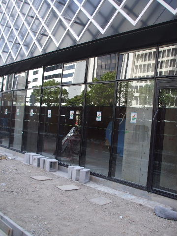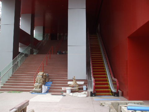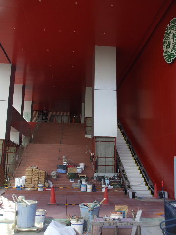 | 2017年10月24日。正面入口エスカレーターの段々も朱色。 | 2017年11月04日。1階北端で一番工事が進んでいるテナント。 |