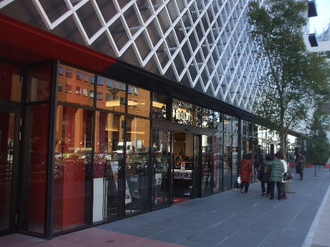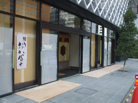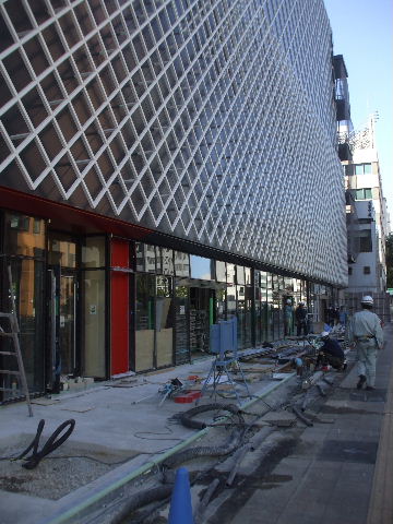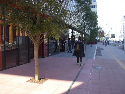 | 2017年12月09日。ビル前、公開空地部分の歩道出来る。店も最後 の仕上げと内覧会中。 |