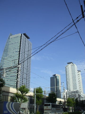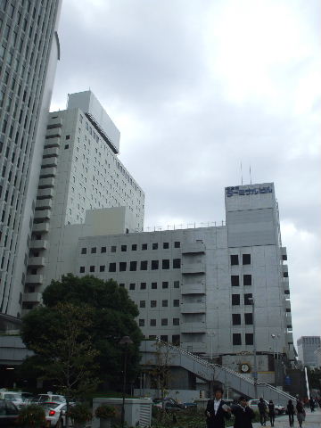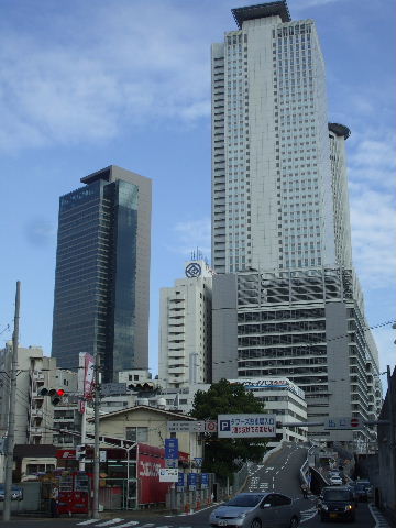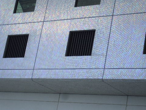 | ホテルと百貨店の境目の通り抜け通路。左ホテル、右百貨店、奥バスターミナル。 | 遠目には白いビルだが近づいてみるとタイルが虹色に反射している。 |