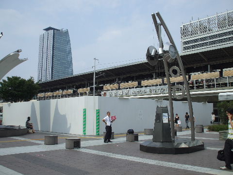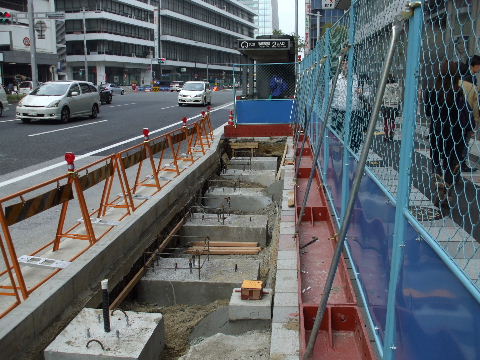 | 切符売り場等の建物も出来てきた。 | 東洋ビル前ではバス停屋根等の基礎工事