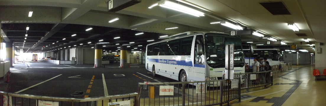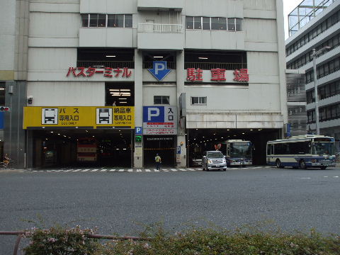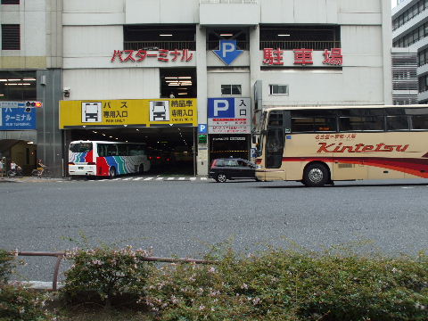 、中央駐車車両入口、右駐車車両とバス出口。 | 2010年8月15日。JRと共同運行している他社バスが入