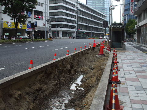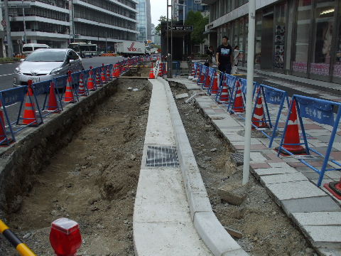 側では歩道の植栽を撤去して市バスの停留所を作る工事が始まった。 |